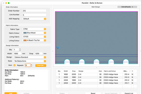 If someone has already entered the essential data - width, drop, design, fabric etc. you don't want to enter it again manually. With Automatic Data Entry (ADE) the process of developing a pattern is fully automatic. An order list sent from your factory management software will be opened by ParaSol to generate an entire list of designs ready to export to Tangent and cut.